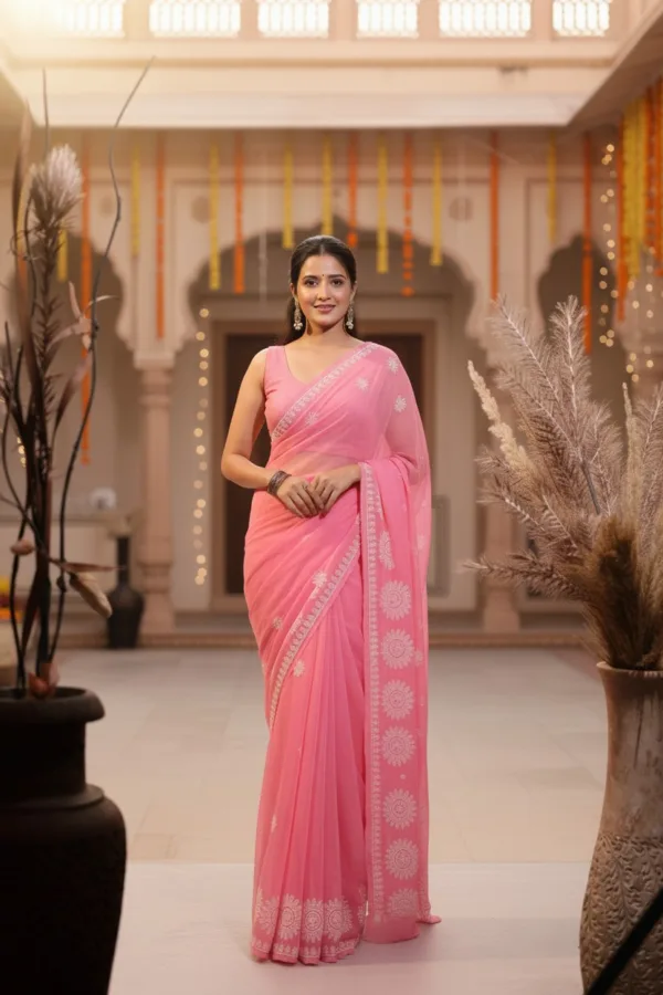 Each motif is meticulously hand-embroidered by skilled artisans, reflecting the cultural richness and finesse of Lucknow’s traditional Chikankari craft. The saree drapes effortlessly, offering a luxurious flow and comfort that makes it perfect for festive occasions, celebrations, or elegant gatherings.