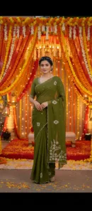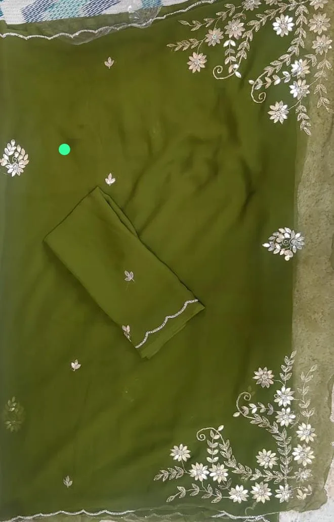 This premium saree showcases intricate Gota Patti work on the pallu, adding an element of traditional elegance to a contemporary design. The delicate embellishments on the fabric create a striking contrast, making it the perfect choice for special occasions. The soft, flowing material drapes beautifully, ensuring comfort and style in every movement. Paired with a simple yet sophisticated blouse, this saree is ideal for evening events, weddings, or celebrations where you want to make a lasting impression. The craftsmanship and attention to detail in the Gota Patti work enhance its luxurious appeal.